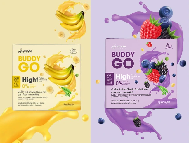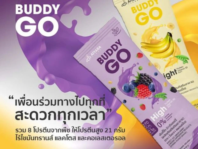 Buddy Go รสกล้วยหอม อุดมด้วยโปรตีนจากพืช 8 ชนิด และยังอุดมด้วยกรดอะมิโน แมกนีเซียม ซิงค์ออกไซด์ แคลเซี่ยม วิตามินเอ และวิตามิน เค