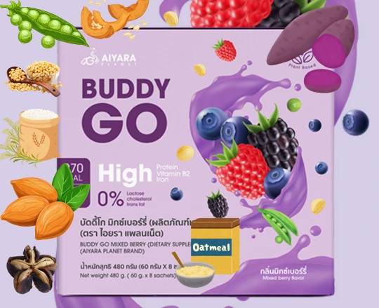 Buddy Go Mixed Berry อุดมด้วยโปรตีนจากพืช 8 ชนิด นอกจากนี้ยังอุดมไปด้วยกรดอะมิโน วิตามินบี 2 และธาตุเหล็ก